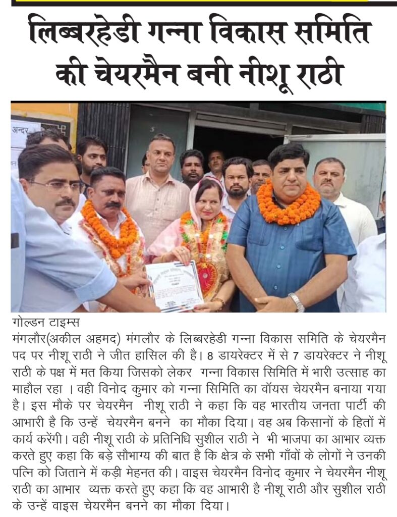 लिब्बरहेड़ी गन्ना विकास समिति की चेयरमैन बनी नीशू राठी Leave a Comment / media / admin लिब्बरहेड़ी गन्ना विकास समिति की चेयरमैन बनी नीशू राठी Read More »